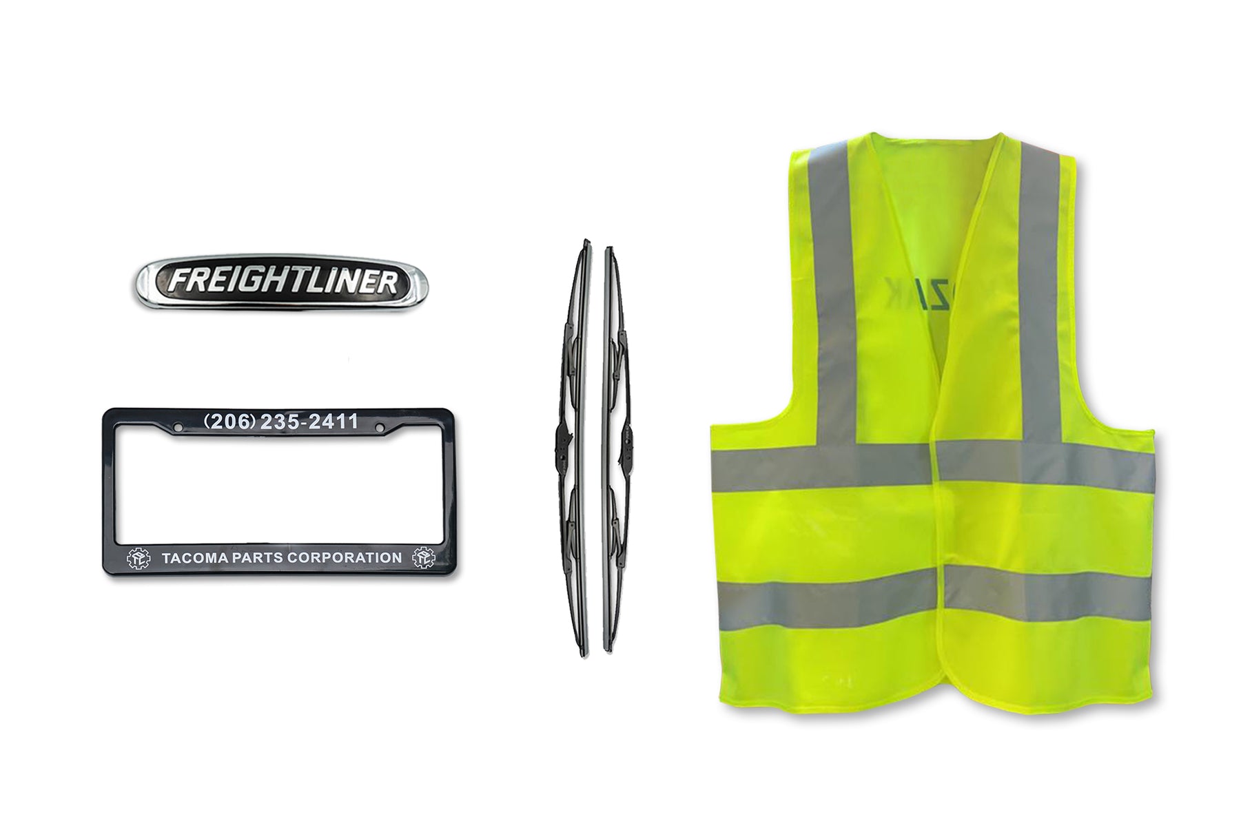 Incluye emblema con el logotipo, 2 limpiaparabrisas de 22 pulgadas, portaplacas y chaleco.