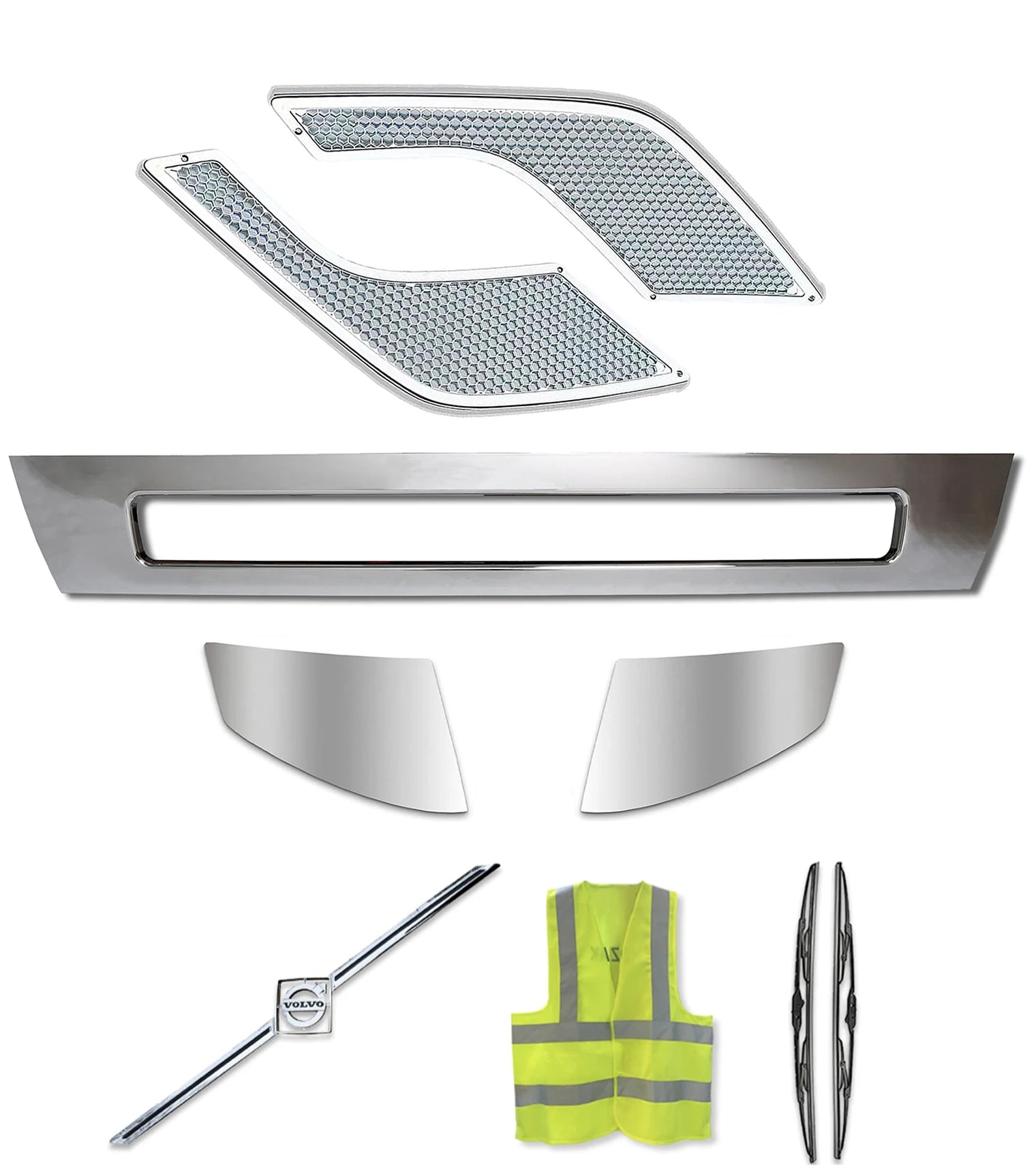 - The set includes: Center Bumper Chrome Strip, Chrome Trim Set (Left and Right Side), Air Intake Vent Set (Left and Right Side)