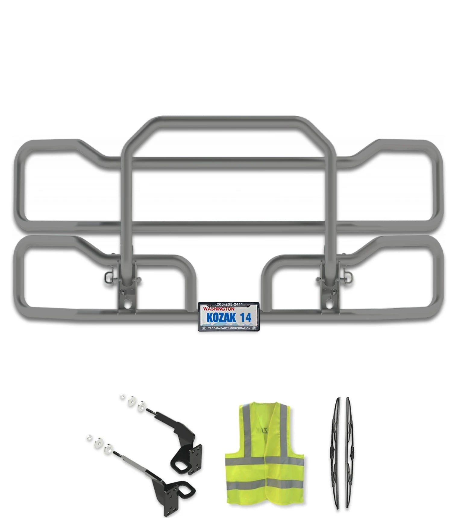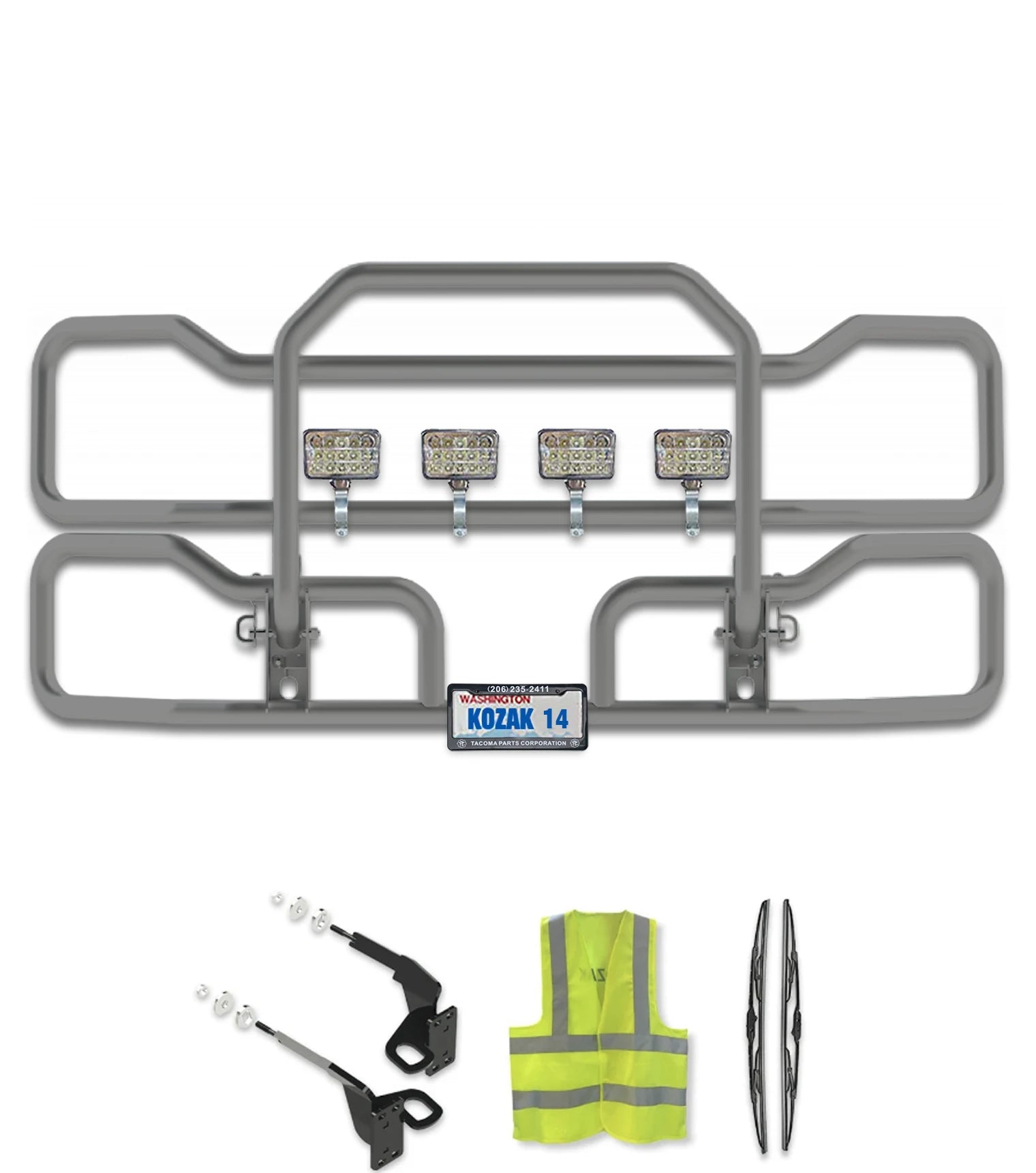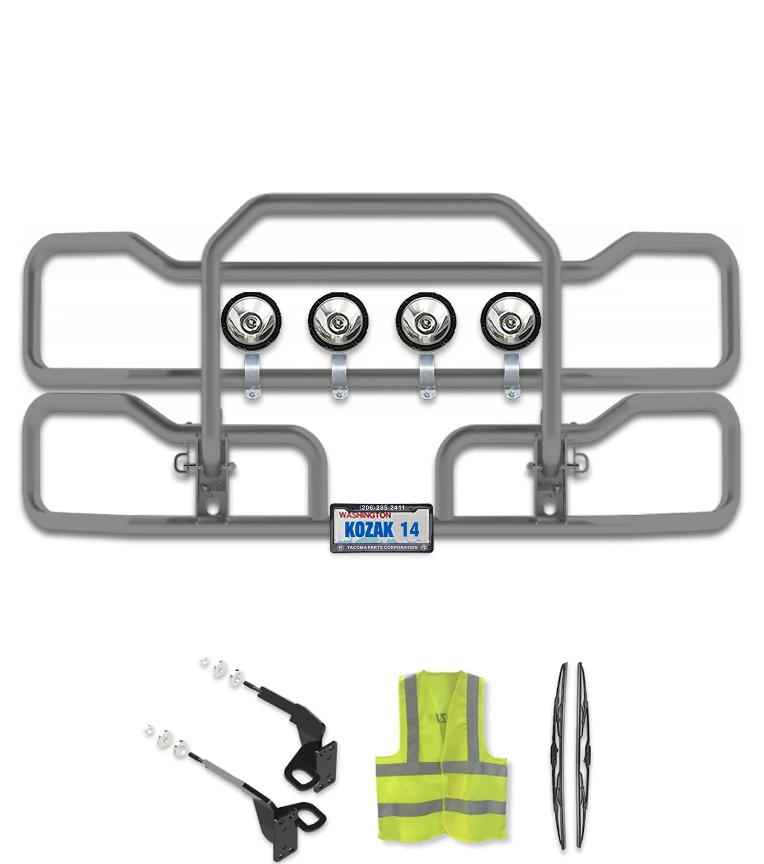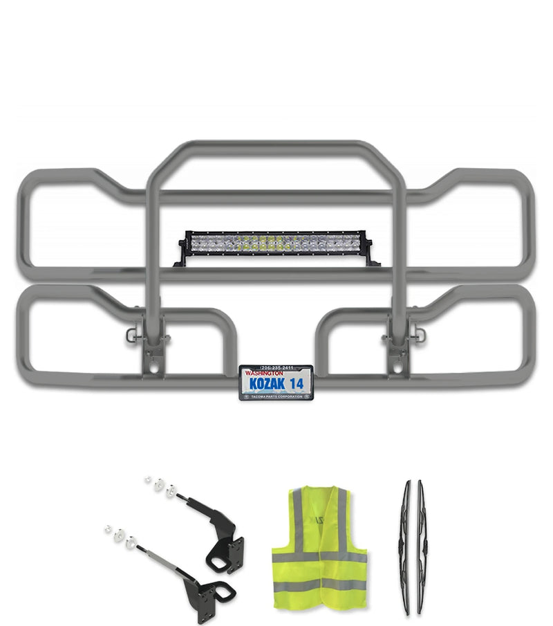 INCLUDES: Bumper Grille Guard, Mounting brackets, your choice of lights, Logo Emblem, License Plate Holder, License Plate Frame, 2x22" Windshield Wipers, Kozak Vest