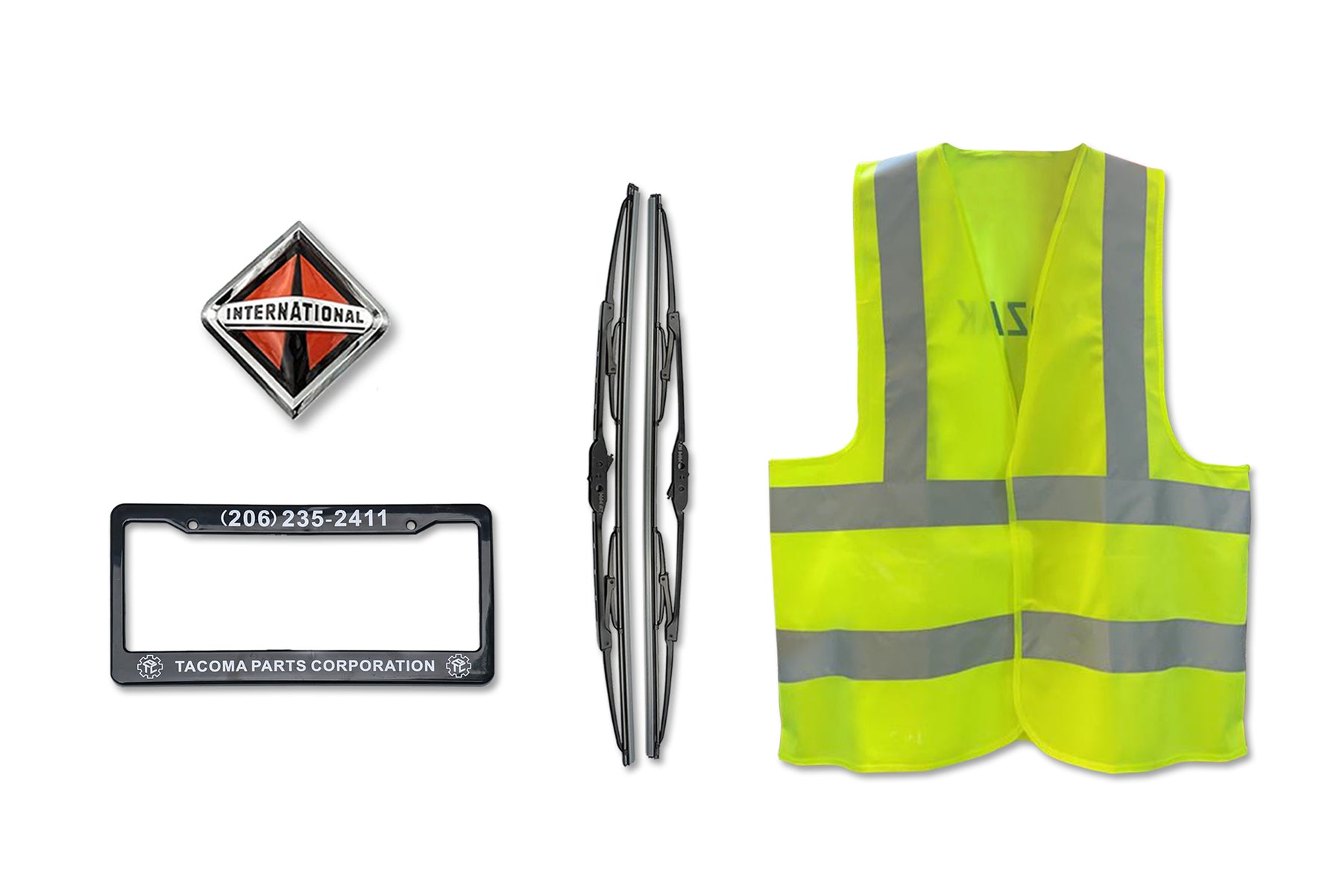 - Comes with International Logo, License Plate Frame, 2X 22 Windshield Wipers and Vest